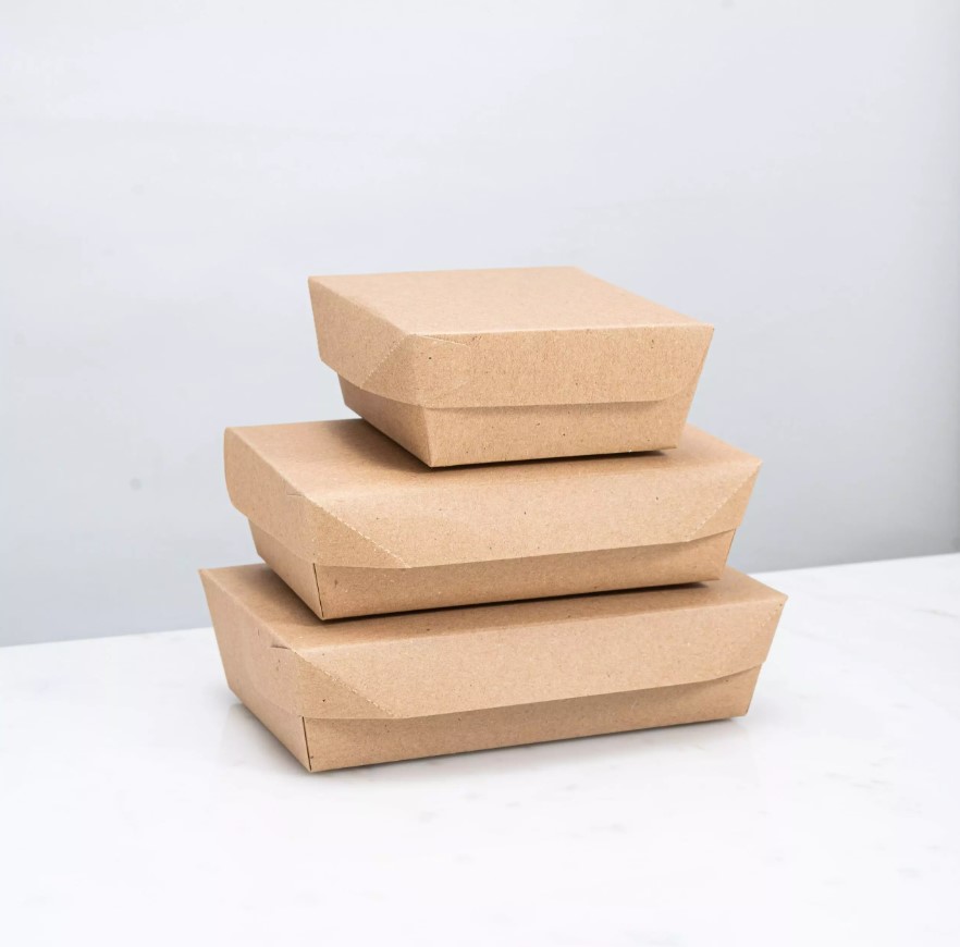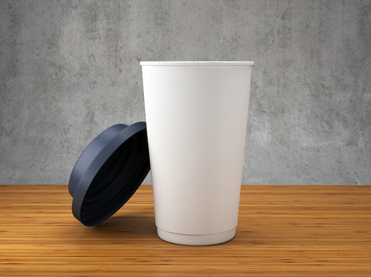 Set kemasan makanan cepat saji. Cangkir kopi kertas di tempat, kotak makanan, kantong kertas coklat terisolasi di atas putih